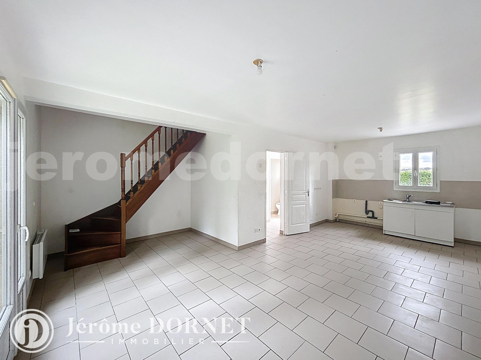 Offrant entrée, cuisine ouverte sur séjour, wc, à l'étage palier desservant trois chambres, salle de bains.